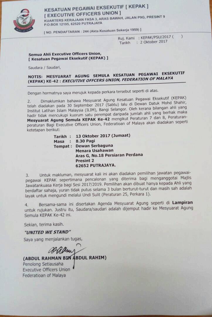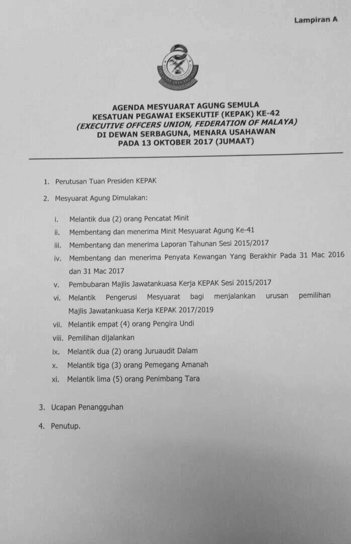 Kesatuan Pegawai Eksekutif (KEPAK) akan mengadakan Mesyuarat Agung Semula KEPAK ke 42 pada ketetapan berikut: